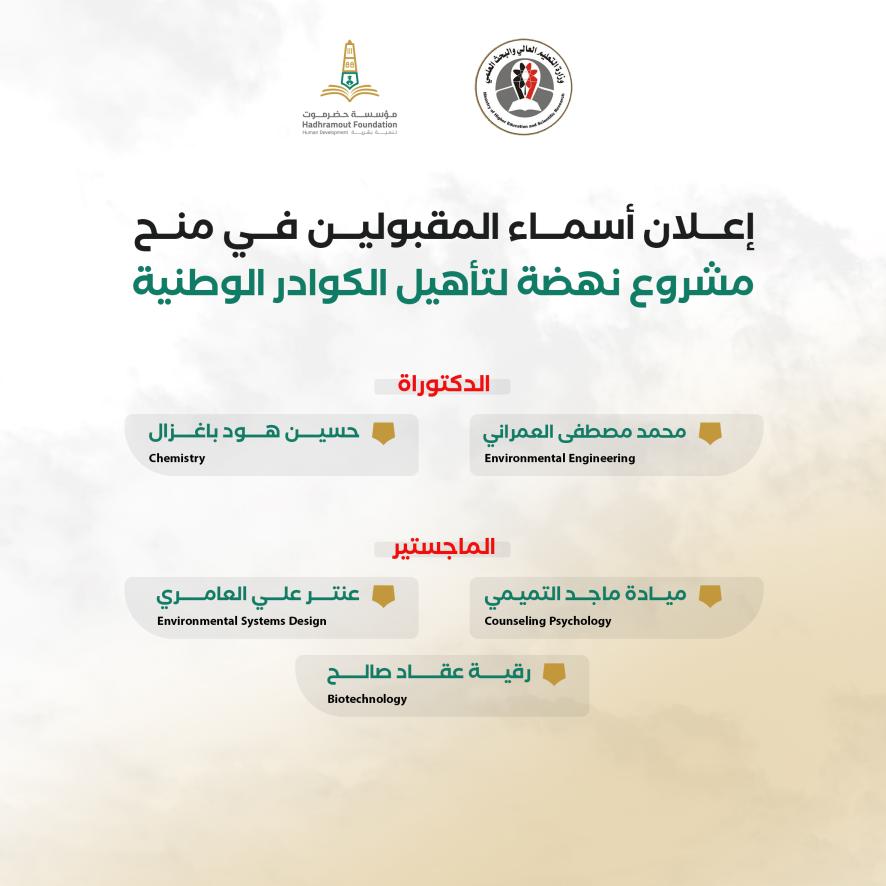 تعلن وزارة التعليم العالي والبحث العلمي والتعليم الفني والتدريب المهني ومؤسسة حضرموت تنمية بشرية،أسماء المقبولين في منح مشروع نهضة لتأهيل الكوادر الوطنية إلى الجامعة الأمريكية بالقاهرة.