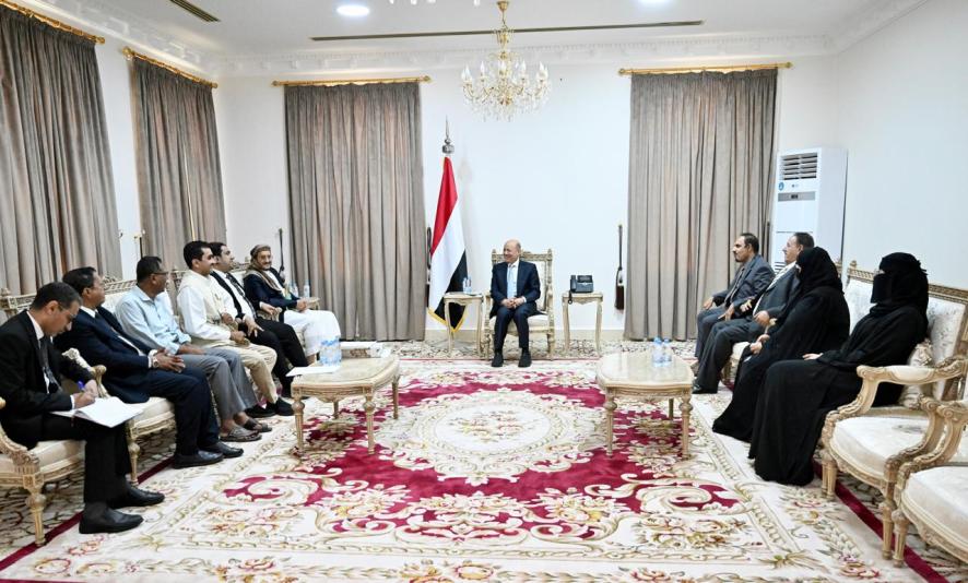 His Excellency Dr. Rashad Mohammad al-Alimi, Chairman of the Presidential Leadership Council, along with Council member Mr. Othman Megali, met at the Presidential Palace in Mukalla. The meeting was attended by Hadhramout Governor Mr. Mabkhout Mubarak bin Madi, and the Advisor to the Chairman of the Presidential Leadership Council, Eng. Omar Mohsen Al-Amoudi, along with the executive management of Hadhramout Foundation - Human Development, represented by Eng. Tareq Ali Balkhasher, and the directors of partner organizations working in the development sector.